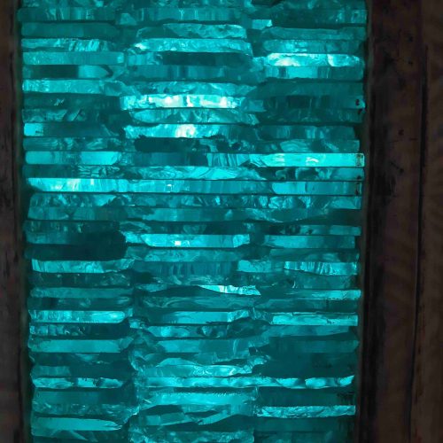 In die Mitte meiner Holskulpturen setze ich gerne zu Blöcken gefügtes Glas ein, in denen sich das Naturlicht ausbreiten und  sich im Tagesverlauf verändern kann.