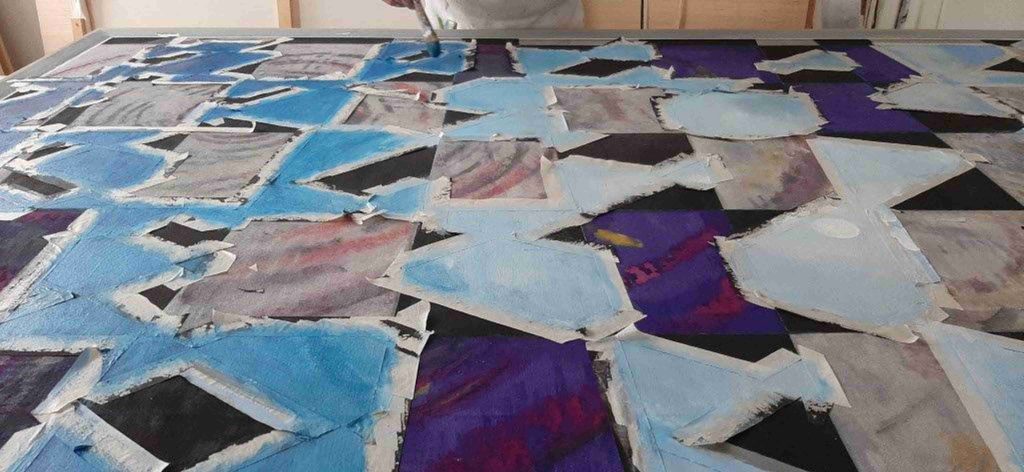 Es ist ein umfangreicher Prozess, der aus vielen Schichten oft nur lasierend eingesetzter Farbe besteht. Schicht um Schicht wird diese aufgetragen, bis die Farbtöne stimmen. Zum Malen ich verwende ich für die abstrakten Bildbereiche und der präzise Formen Farbpigmente, Stein- und Glasmehle und Emulsionen, nur in Teilbereichen, die mehr illusionistisch wirken sollen, die Ölfarbe.
