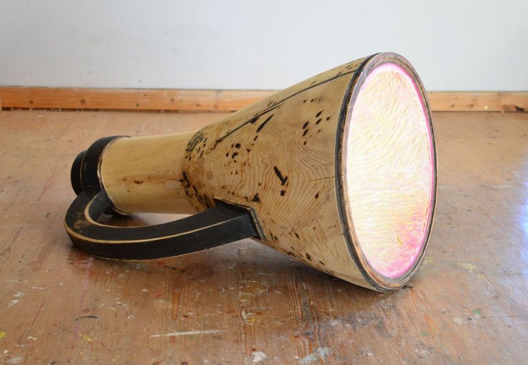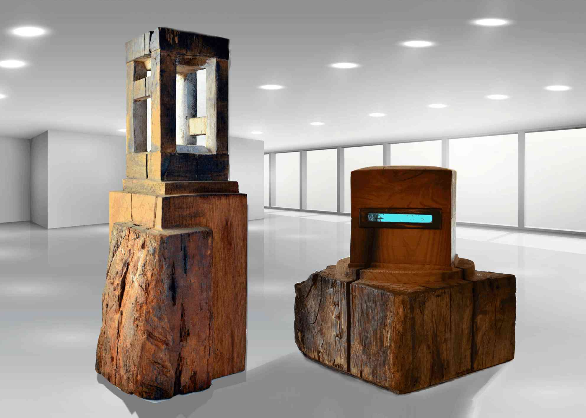 Ich setze meist Holz zu Skulpturen zusammen, die dann stellenweise noch bildhauerisch von Hand bearbeitet werden. Die Idee für eine neue Arbeit bestimmt die Verwendung des Materials: ob und wie Bretter, Bohlen, Stammabschnitte, Balken oder Plattenware zum Einsatz kommen,  Das massive Gefüge ist das Bollwerk, das das zerbrechliche Glas wie ein Schutzpanzer umgibt. Gleichzeitig ist das Glas mit seiner durch das Naturlicht bewirkten Strahlkraft der lebendige Motor, der die Bewegung des Lichtes aufzeigen kann.
