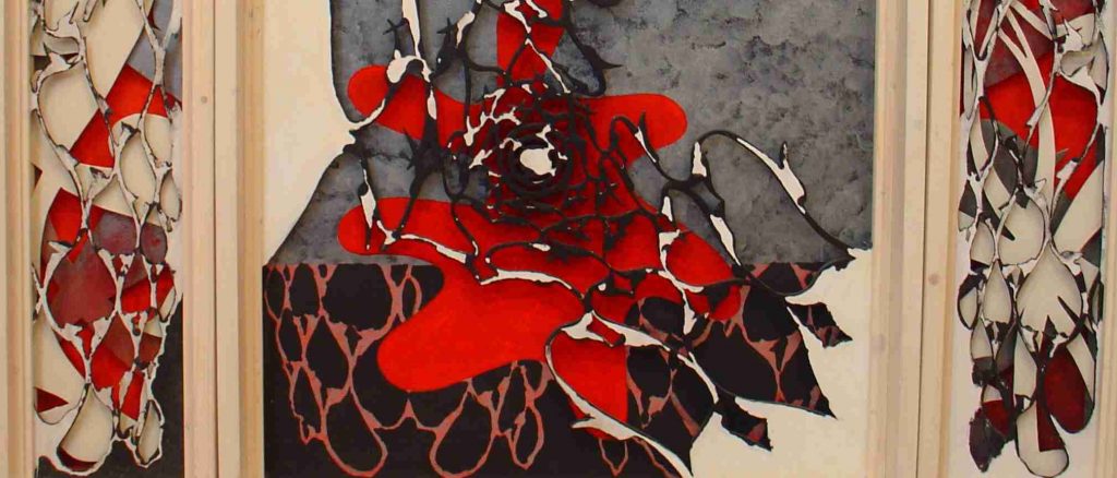 In diesen mehrlagigen Gebilden verwende ich selbst entwickelte Ornamentik, die ich weiterbearbeite: die Muster werden verzogen, gebeugt oder erscheinen in verzerrter Form.